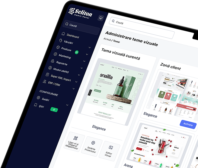 Creează un magazin online cu SELITON și crește-l până la super succes, este ușor! Ai integrari si automatizari cu curierii, procesatorii de plata, ERP si depozit. Alegeți un sistem dovedit, cu funcții 100% funcționale și gata de utilizat și suport complet pentru orice.